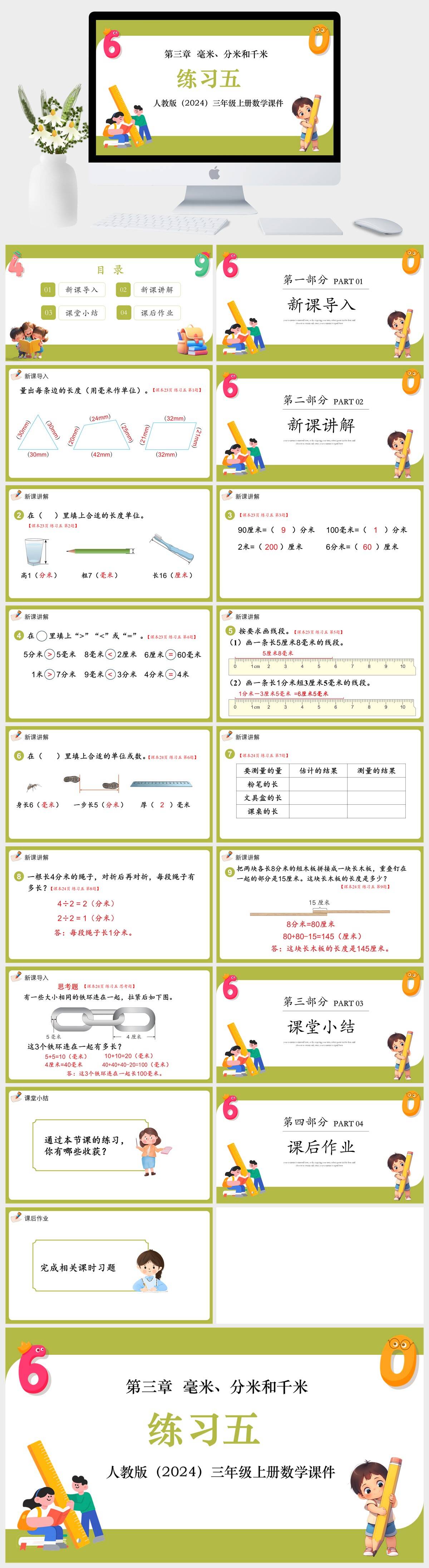 HKSX16-人教版(2024)三年级上册数学第三章 毫米、分米和千米 练习五课件PPT模板