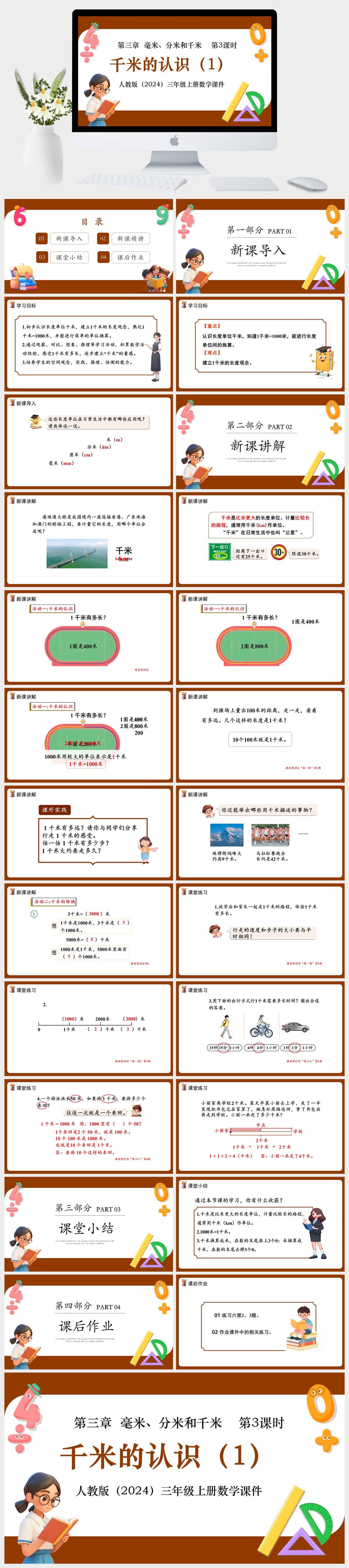 HKSX51-人教版(2024)三年级上册数学第三章 毫米、分米和千米 第4课时千米的认识(2)课件PPT模板