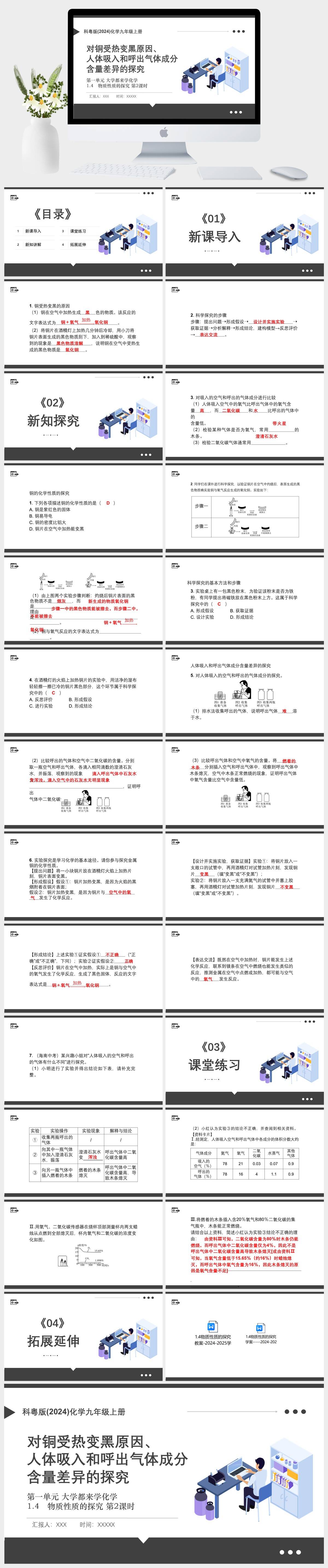 HKHX1260-科粤版(2024)化学九年级上册第一单元 大学都来学化学1.4 物质性质的探究 第2课时对铜受热变黑原因、人体吸入和呼出气体成分含量差异的探究PPT模板成品课件