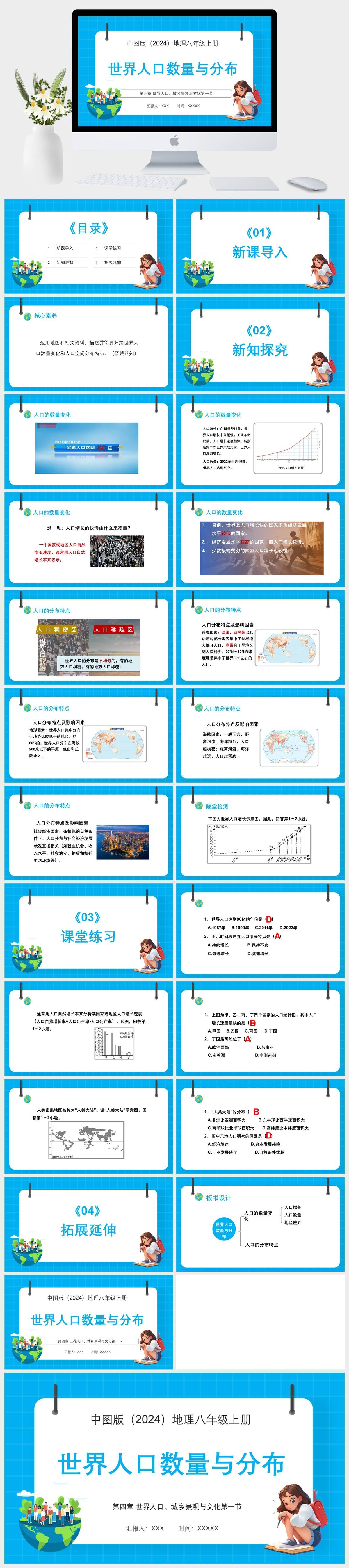 HKDL809-中图版(2024)地理八年级上册 第四章 世界人口、城乡景观与文化第一节世界人口数量与分布PPT模板成品课件