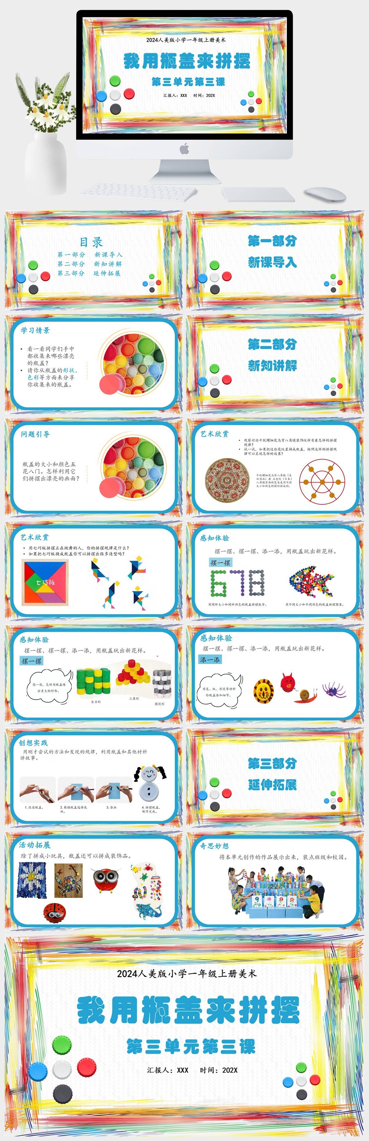 HKMS90-新人美版小学美术一年级上册第三单元第三课《我用瓶盖来拼摆》课件PPT模板