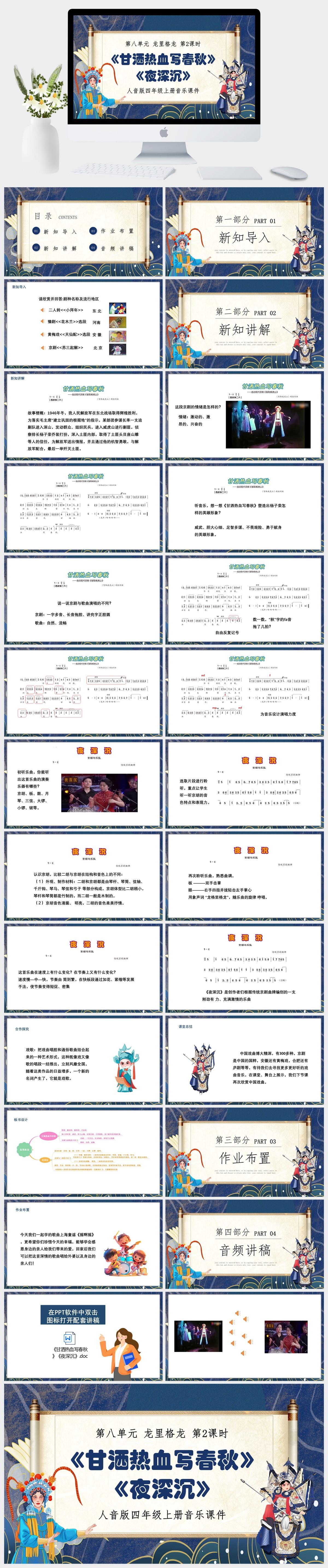 HKM154-人音版四年级上册音乐第八单元龙里格龙第2课时《甘洒热血写春秋》《夜深沉》课件PPT模板