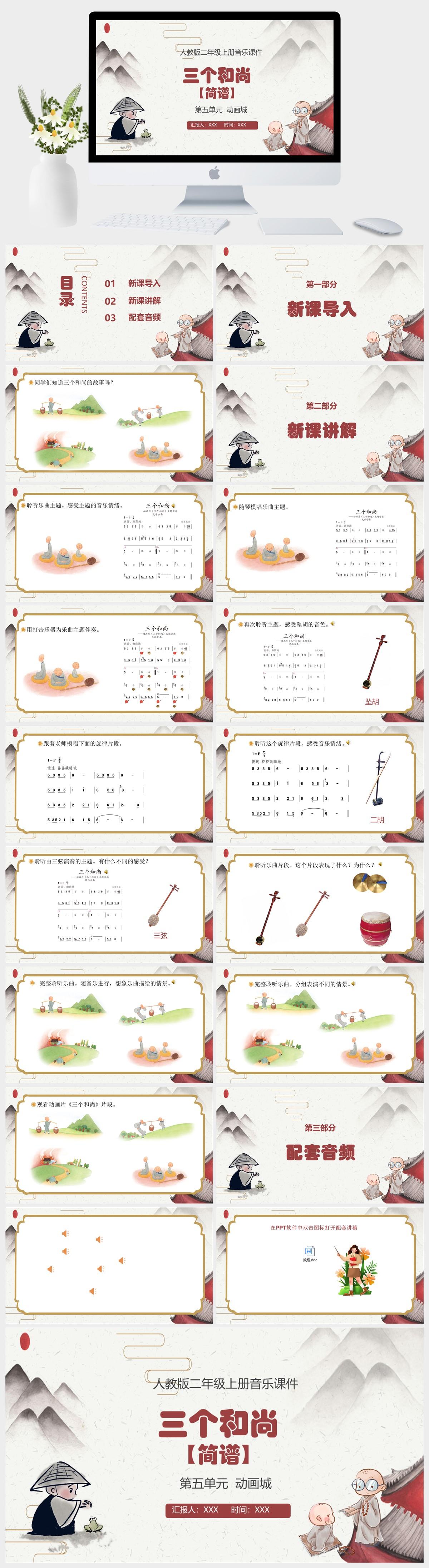 HKM917-人教版音乐小学二年级上册第五单元动画城《三个和尚》(简谱)PPT模板