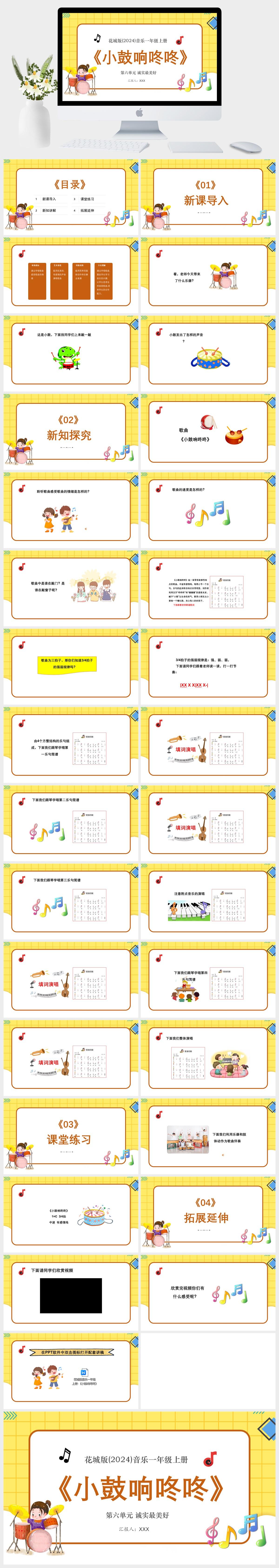 HKM1287-花城版(2024)音乐一年级上册第六单元 诚实最美好 小鼓响咚咚PPT模板