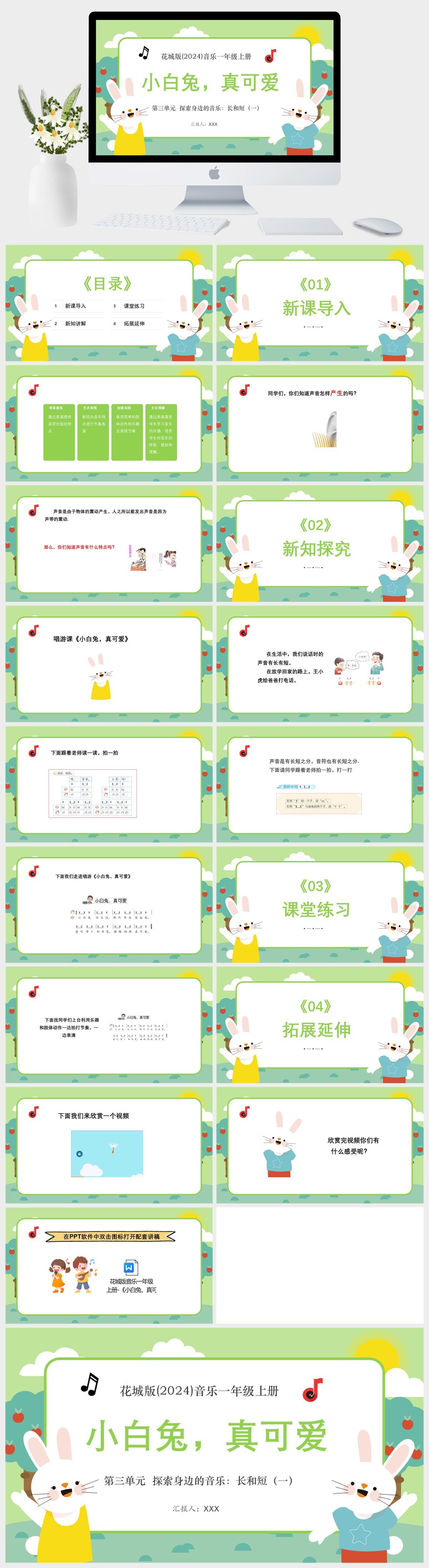 HKM1295-花城版(2024)音乐一年级上册第三单元 探索身边的音乐:长和短(一)小白兔,真可爱PPT模板