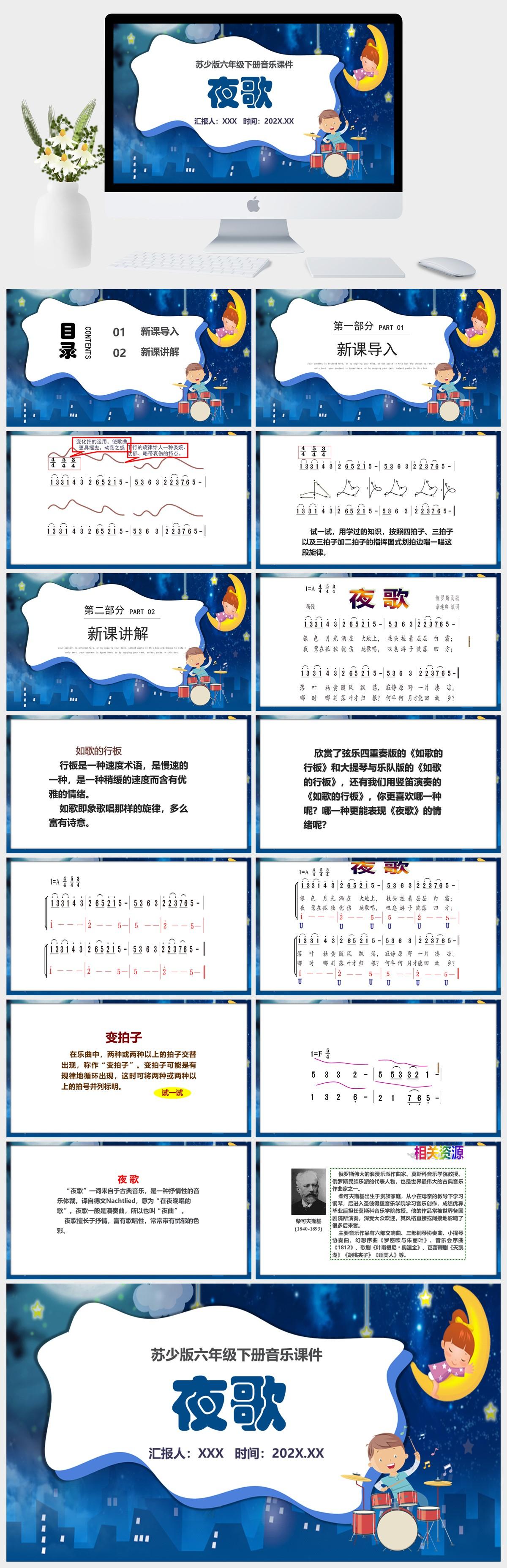 HKM1668-苏少版六年级下册音乐《夜歌》课件PPT模板.