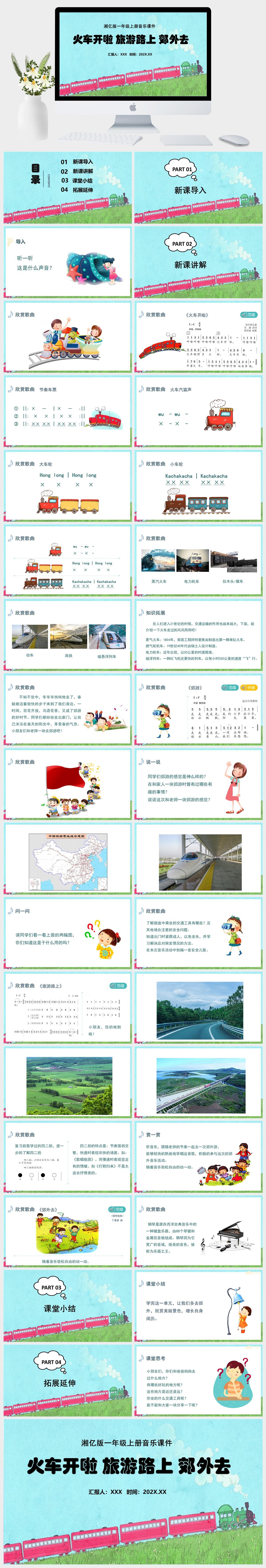 HKM2439-湘亿版一年级上册音乐《火车开啦-旅游路上-郊外去》课件PPT模板