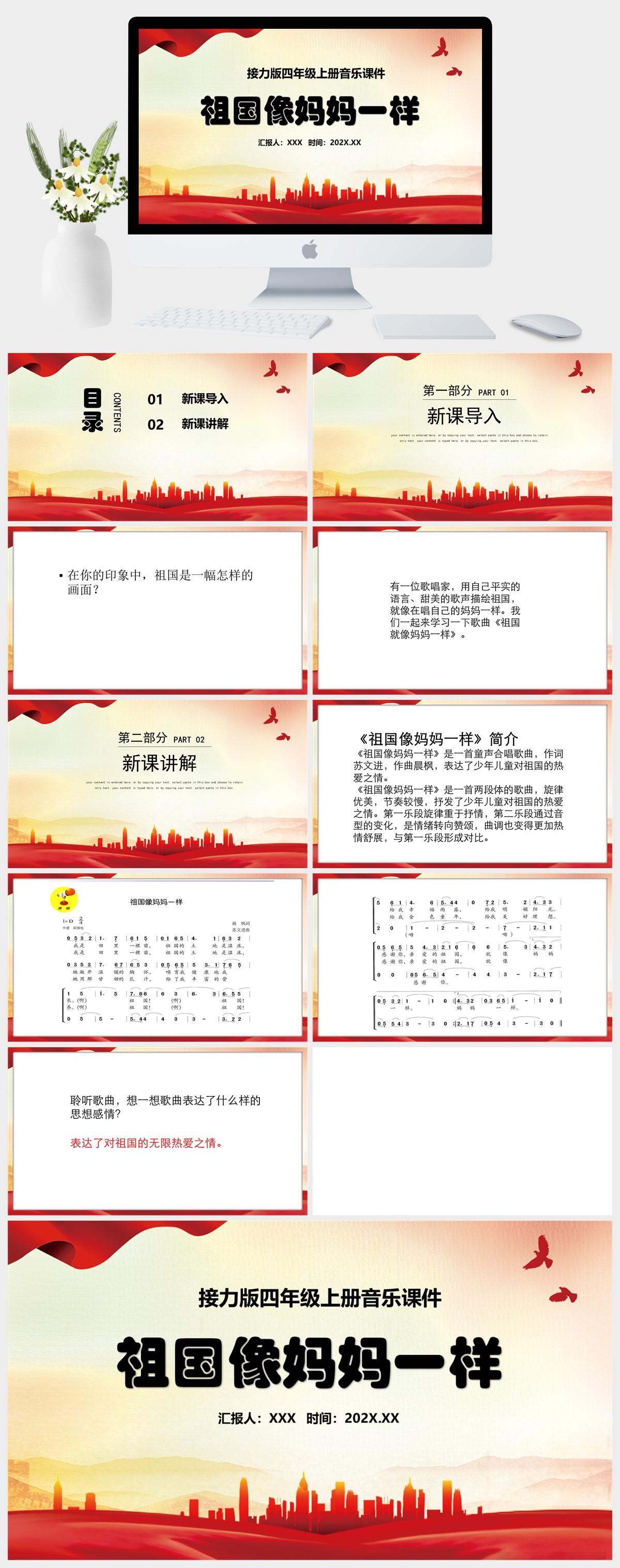 HKM2945-党政风–接力版四年级上册音乐《祖国像妈妈一样》课件PPT模板