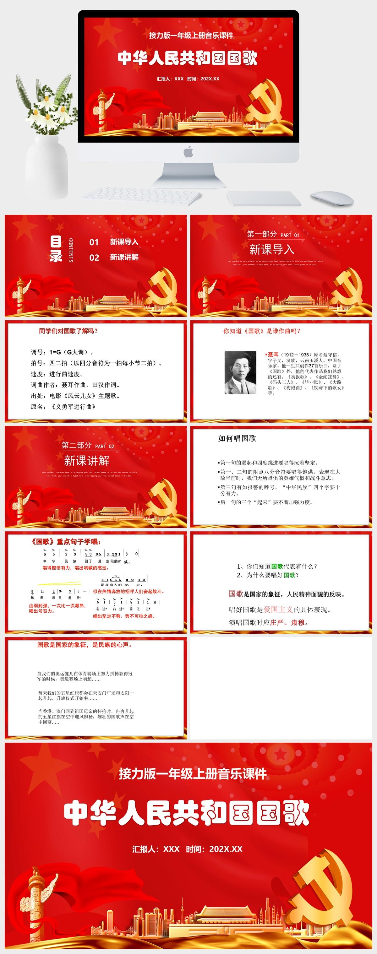 HKM3145-党政风–接力版一年级上册音乐《中华人民共和国国歌》课件PPT模板