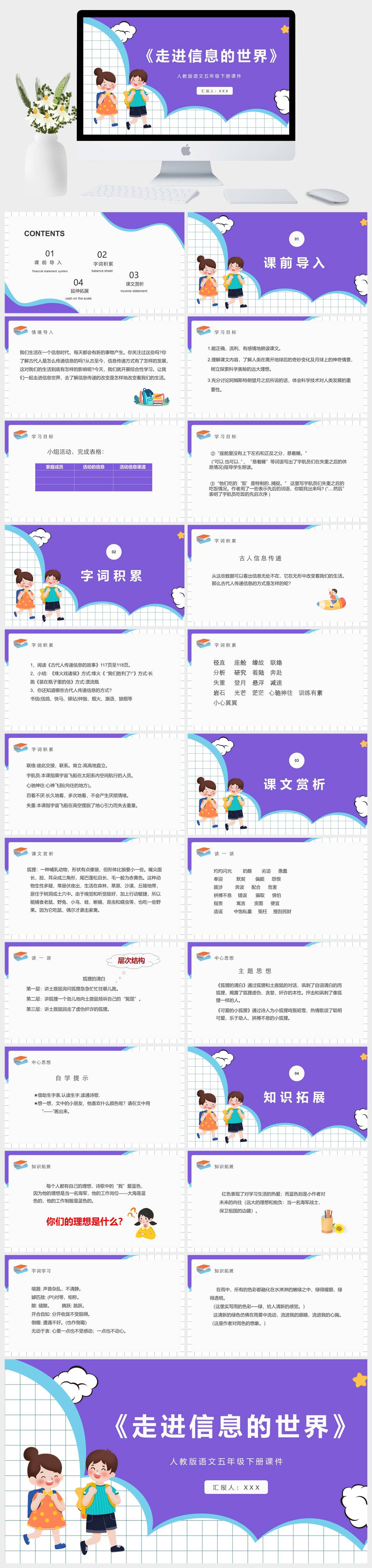 HKYW4391-蓝色网格风人教版语文五年级下册课件《走进信息的世界》PPT模板成品课件PPT